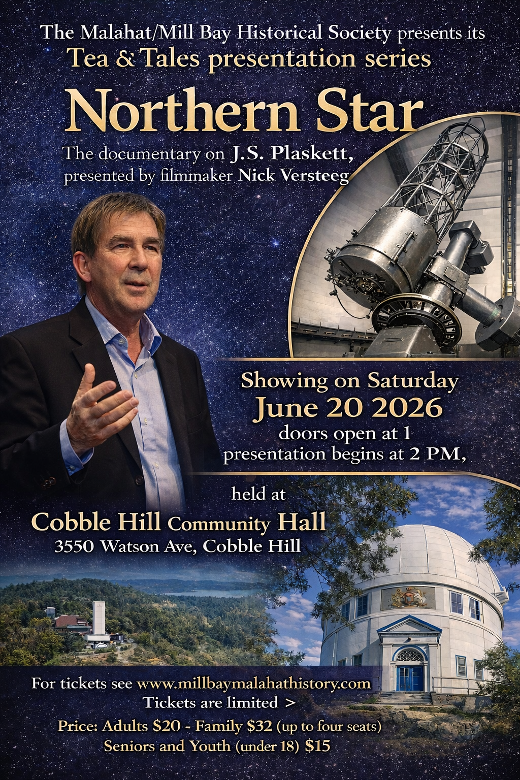A Mill Bay/Malahat Historical Society's Tea & Tales presentation of "Northern Star" a documentary of J.S. Plaskett the astronomer who founded the Dominion Astrophysical Observatory just north of Victoria in 1918. The telescope was briefly the largest operating telescope in the world. His work helped establish Canada as a leader in astronomy and scientific research. Presented by renowned local film maker, Nick Versteeg.